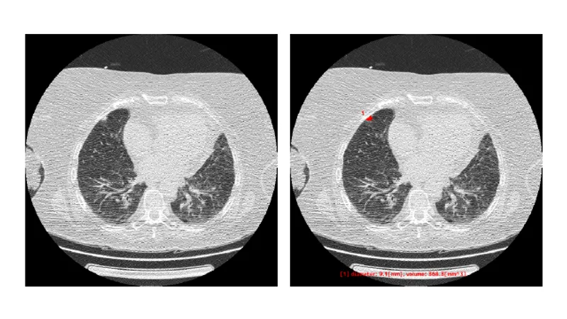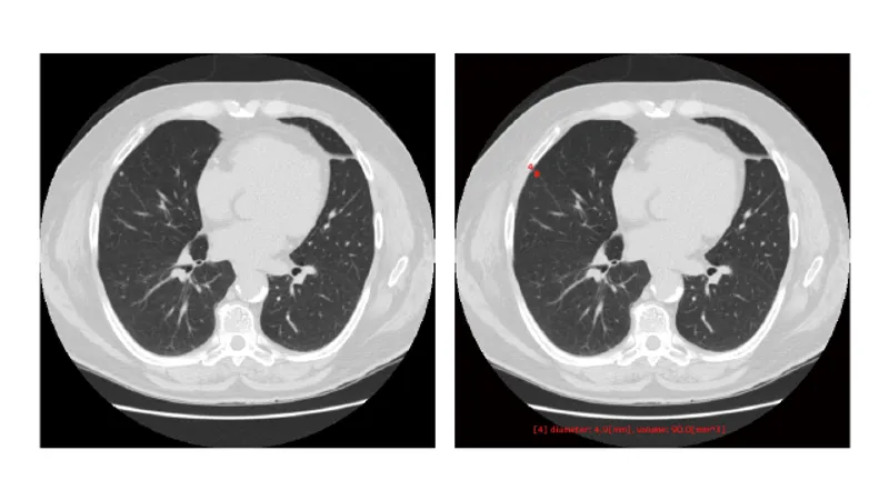 本サービスは胸部 CT 画像における肺野領域の組織について、関心領域を抽出し体積と最大径を測定します。 また、関心領域の最大径が閾値以上であれば色付けを行います。