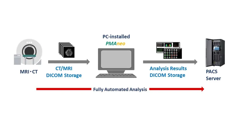 本ソフトウェアは、汎用IT機器にインストールして使用し、画像の情報通信はDICOM規格に準拠しています。 患者の脳血流情報を自動で画像化することで、診断の補助を行うサービスです。