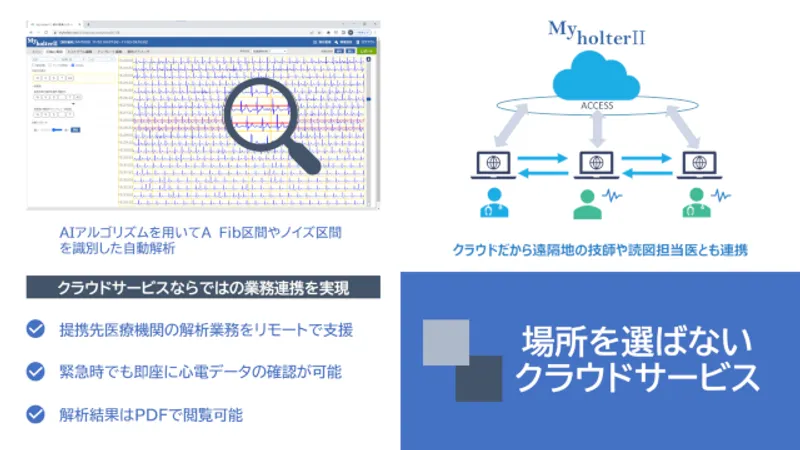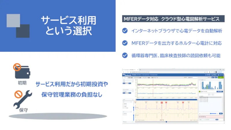 AIアルゴリズムを用いたホルター心電図向け自動解析サービス。クラウドサービスのため初期費用は不要