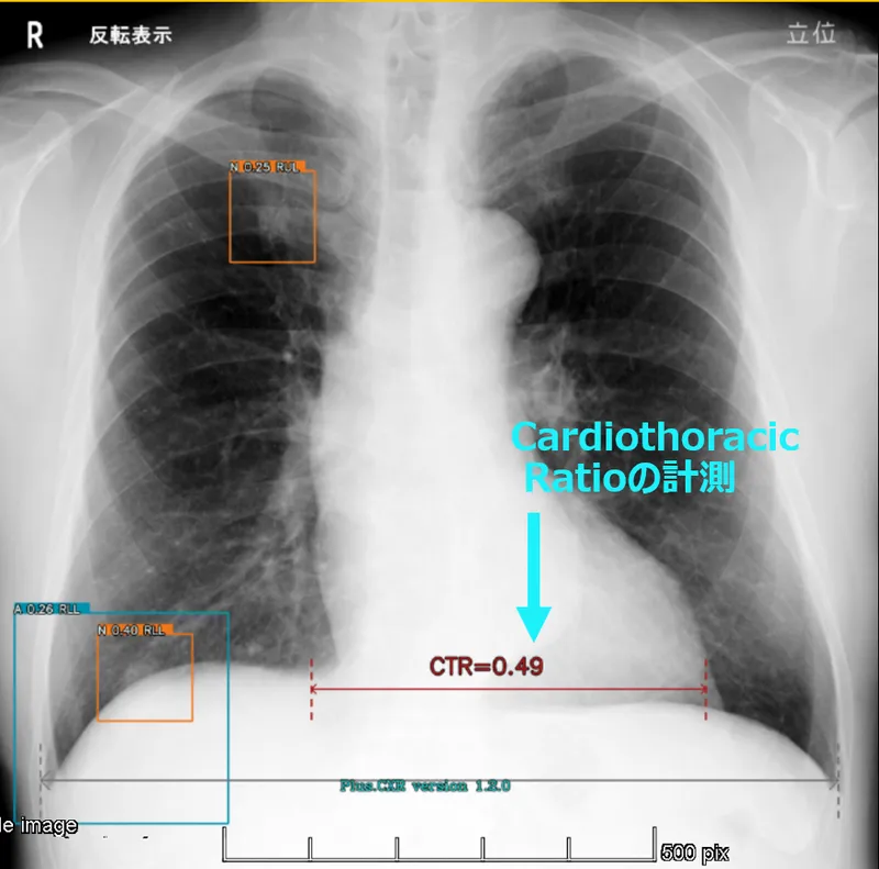 心臓や横隔膜と重なる部分も対象です AUC91~96% Cardio-Throacic Ratioを自動計測します
