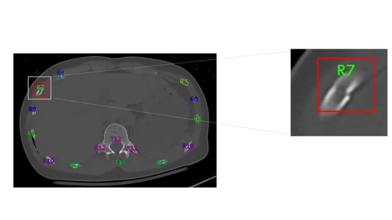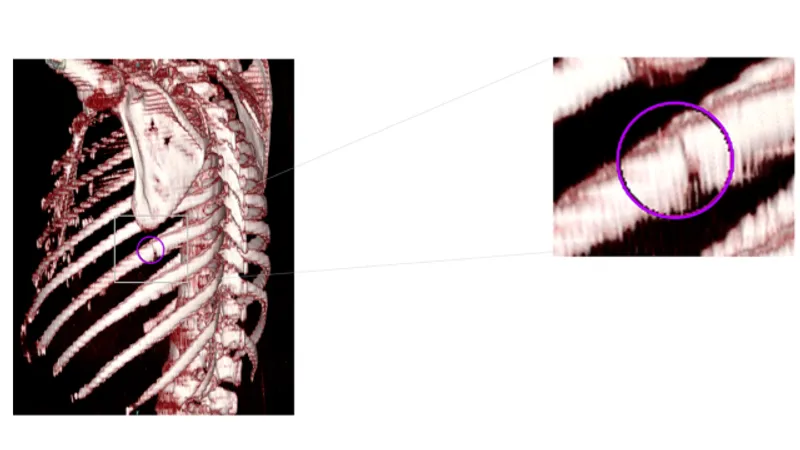 胸部CT画像から肋骨骨折の候補を検出して表示する機能です。医師が再確認することで見落しを低減します。