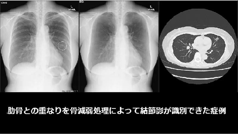 以前から提供している胸部読影支援の画像処理「Bone Suppression処理(胸部骨減弱処理)」や「Temporal Subtraction処理(胸部経時差分処理)」と併用することも可能です。 Bone Suppression処理で骨を減弱させることで、骨と重なった病変の視認性が向上し、AIと併用することによって、より読影精度の向上が期待できます。 また、Temporal Subtraction処理で現在と過去の差分画像を生成すると、経時的な変化が可視化されるので、経過観察が容易になります。