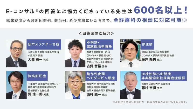 本サービスは医師のみが利用できるサービスとなっております。また、診断・診療の責任は常に診療行為を行う主治医が持ち、回答いただく専門医の助言はあくまでも参考として診療に役立てて頂きますようお願いしております。