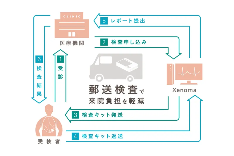 本サービスは、病院、クリニック、健診センターにて提供されます。 受検者自らが自宅で検査を開始するホルター心電図の郵送検査サービスです。