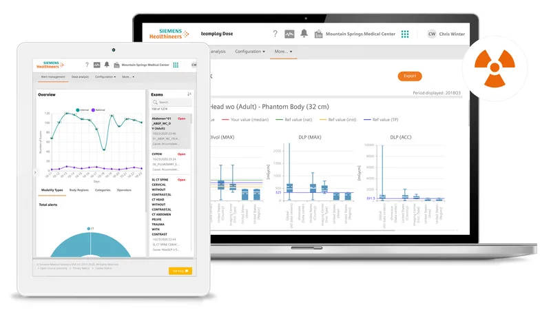 teamplay Doseは院内の線量データを簡単に集計しアクセスできるようにすることで、日本のDRLs2020に準拠した線量管理が可能となり、被ばく線量の評価及び最適化を行うことができます。 各検査プロトコルの中央値の把握を簡便に行うことができ、患者個人単位の累積被ばく線量の確認や、臓器線量によるシュミレーション機能も搭載されています。 施設の中央値や75パーセント値は箱ひげ図より一目で評価を行うことができ、ばらつき度合いを視覚的に判断できます。 アラート機能では外れ値を簡単に確認し、対策を講じることができます。 グローバル及び国内での線量標準値をベンチマークすることで、自施設の線量情報をより客観的に確認することができます。