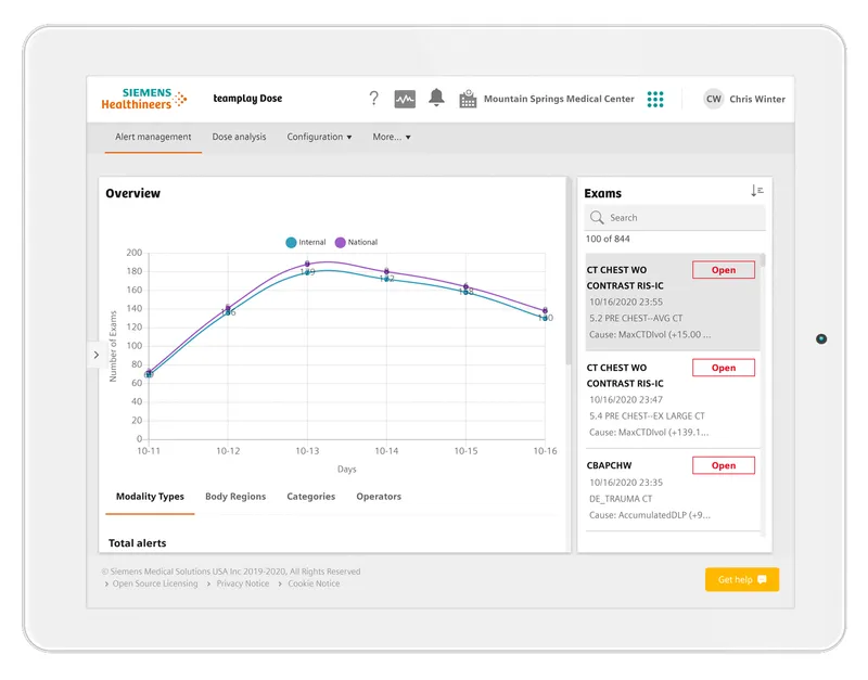 teamplay Doseは院内の線量データを簡単に集計しアクセスできるようにすることで、日本のDRLs2020に準拠した線量管理が可能となり、被ばく線量の評価及び最適化を行うことができます。 各検査プロトコルの中央値の把握を簡便に行うことができ、患者個人単位の累積被ばく線量の確認や、臓器線量によるシュミレーション機能も搭載されています。 施設の中央値や75パーセント値は箱ひげ図より一目で評価を行うことができ、ばらつき度合いを視覚的に判断できます。 アラート機能では外れ値を簡単に確認し、対策を講じることができます。 グローバル及び国内での線量標準値をベンチマークすることで、自施設の線量情報をより客観的に確認することができます。