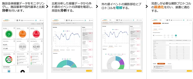 DICOMデータ(RDSR,RRDSR)を瞬時に分析し、各検査プロトコル、検査部位、装置ごと等の線量情報をモニタリングし、放射線科の線量管理業務をサポートします