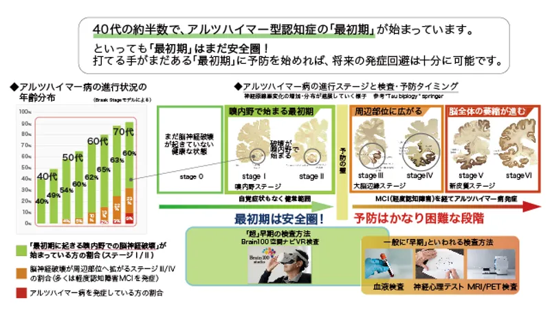 本VR検査は、アルツハイマー型認知症の発症につながる神経原線維変化が最初期に起こる嗅内野の担う空間ナビゲーション機能を測定し、検査時の脳健康判定を支援するものです。継続的なVR検査とリスク要因を見える化するヘルスチェック(健康アンケート)により、行動変容を促すことが期待できます。