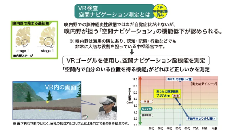 •アルツハイマー病などの最初期に発生する神経原線維変化を起こす脳の部位は嗅内野。嗅内野が特徴的に有する機能である「空間ナビゲーション脳機能」の性能をVRゴーグルによる10分程度の検査で測定する検査 • 検査結果としては、「エラー距離」と1000例を超える被検者のデータによる年齢平均値を「脳健康年齢」(いずれも参考値)として返します。